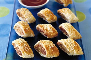 Place a sheet of pastry on a lightly floured surface and cut horizontally into two. Spoon a quarter of the mixture along the centre of each piece of pastry. Fold over a long side of pastry, brush with egg, then fold other side over to enclose, slightly overlapping in the centre, and make a long sausage shape. Repeat with remaining pastry and filling to make 4 rolls.