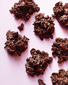 2.Place 2/3 cup chocolate in a medium heatproof bowl set over (not in) a pot of simmering water. Stir occasionally until chocolate melts, 3 to 5 minutes. Remove from heat and add remaining chocolate, stirring until melted. (Alternatively, microwave the chocolate in a bowl in 30-second increments, stirring after each, until melted.) Pour over cornflake mixture and, with a rubber spatula, gently fold just until cereal and cherries are completely coated.