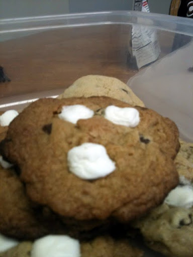Use 2 tablespoons or a medium-sized ice cream scoop to drop rounded tablespoons of dough onto cookie sheets. Bake for 7 minutes and remove from oven. Push a few marshmallows and pieces of chocolate into each cookie and return to the oven to bake an additional 3-4 minutes. Allow to cool on a wire rack before inhaling the entire batch!