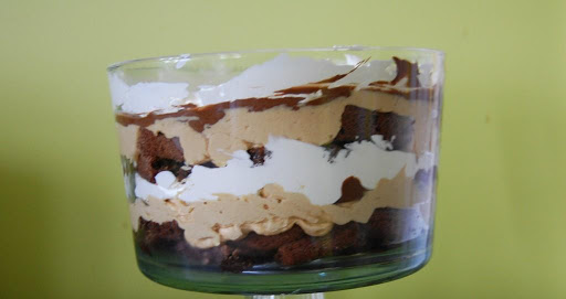 Cut cooled brownies into small squares and make one layer in the trifle bowl.