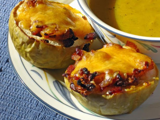 Cover the apples with the onion and bacon mixture. Cover the dish with foil and bake at 350° to 400°until the apples are tender, about 30 minutes. Remove the foil and sprinkle with the cheese. Broil until the cheese begins to brown.