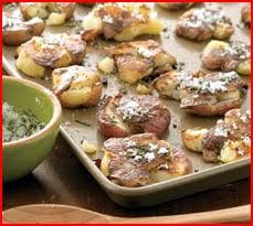 2. Meanwhile, heat oven to 450°F. Place potatoes on work surface. With flat side of meat mallet, press gently on each potato to crush into 3/4-inch-thick cake. Place on large rimmed baking sheet; brush both sides of potatoes with oil. (Potatoes can be prepared to this point 2 hours ahead.)