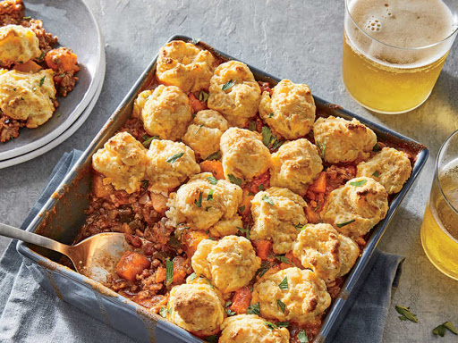 We thicken the chili slightly, stir in more fresh fall vegetables, and bake with a flaky cheddar biscuit topper for a fun, fast take on a classic potpie. Creamy butternut squash and hearty beef chili provide combine to make this wholesome, easy weeknight dinner. We skipped the hassle of peeling and chopping the squash by buying the packaged cubes. Topped with flaky cheddar biscuits that rest atop the potpie like soft pillows, this meaty dish is a great way to repurpose chili and make use of seasonal fall vegetables. The kids won't be able to resisting dunking biscuit after biscuit in this flavorful beef chili. Use a vegetarian chili for a tasty meat-less option.