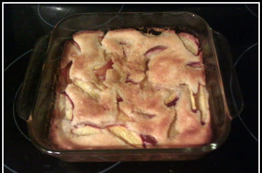 Pour batter into pan, on top of the butter. Do not mix the batter with the melted butter. Place fruit on top of the batter.