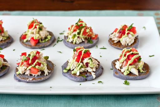 Blue/Pink Corn Blini with Crabmeat and Avocado Crema
