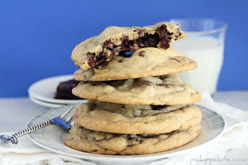 4. Place a large cookie scoopful of dough on top of a brownie square and another large scoop on the bottom. Gently press and enclose brownie with dough adding pinches more dough to cover sides if needed. Place 6 filled cookies onto a parchment or silpat lined baking sheet and bake for 18-22 minutes or until edges are golden brown. Remove and let cool for 15 minutes before removing from baking sheet.