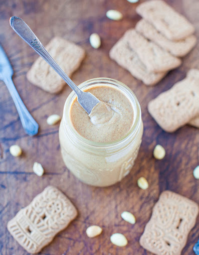 My two favorite spreads are combined into one. It doesn't taste exactly like Cookie Butter, but it takes on more of a cookie butter flavor quality than that of peanut butter. It's loaded with cinnamon and gingersnap cookies, which also give the spread a slightly grainy texture, similar to the texture of storebought Cookie Butter and Biscoff Spread. If you've never made homemade nut butter or spreads before, you'll never look back. Once you try fresh, homemade nut butter, you'll fall in love with the rich, wholesome taste, and the purity of flavors. It takes less than 10 minutes, is effortless, and you'll wonder why you haven't been doing this forever.
