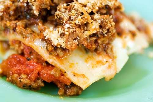 15. Spoon just under 1/2 the meat mixture on top of the mozzarella. Spread evenly, being careful not to disrupt the layers below.