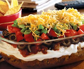 Top with sour cream then salsa. Sprinkle olives, tomato and onion on top. Cover with cheese.