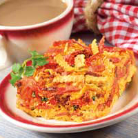 Combine cooked chorizo, tortilla strips, cheese, diced pimientos, onions and eggs in prepared baking dish. Spread mixture evenly. Bake on center rack for 25 minutes. Cut into squares and serve.