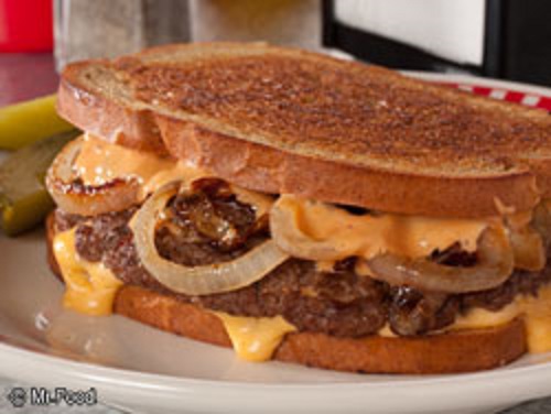 Place 2 slices of cheese on 2 slices of toast, top each with a beef patty, half the onion slices, and salad dressing. Top with remaining toast and serve immediately.