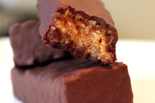 Using a fork, dip the bar into the melted chocolate and push it just under the surface of the chocolate.