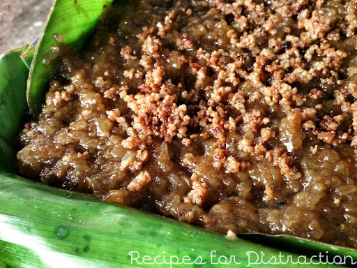 For an alternate (easier) method, you will need 4 cups rice (soaked overnight and drained), 2 cups coconut cream, and 2 cups brown sugar. Prepare rice in a rice cooker on the “sweet rice” setting, using as much water as needed for 4 cups rice. When done, mix in 1 cup sugar and 1 cup coconut cream. Pour into greased 9×13 pan and smooth the top. Mix remaining 1 cup brown sugar and 1 cup coconut cream until smooth, and pour over rice. Bake at 350ºF for about 1 hour or up to 1 1/2 hours, until topping is dark brown and has thickened.