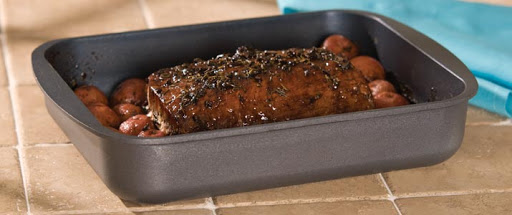 Place pork loin in shallow baking dish and surround with the red potatoes.