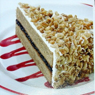 Using mixer, combine heavy whipping cream, confectioners sugar and vanilla. Whip until stiff peaks form. Cover the torte in whipped cream and chopped walnuts.