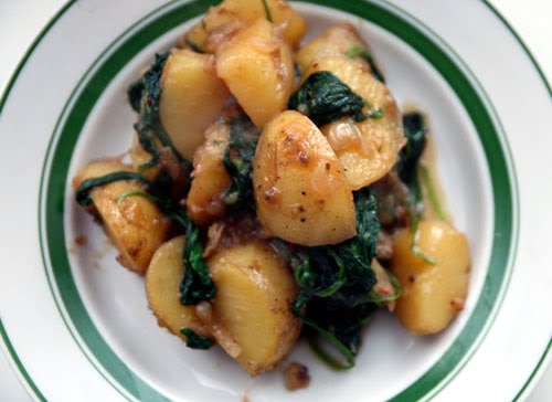 5 When the potatoes are close to soft, uncover and add the spinach. Add more water if necessary to avoid burning. Continue cooking until the potatoes are tender, increasing the heat if desired to brown the potatoes. Season to taste with salt and serve.