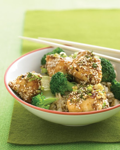 Meanwhile, place saucepan with steamer basket over high heat; bring water to a boil. Add broccoli, and cook until crisp-tender, 4 to 6 minutes. Serve sesame chicken with broccoli and rice.