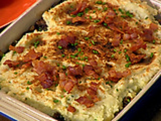 Temper egg yolk by beating it with the starchy potato cooking water. Place drained potatoes back into the pot you cooked them in to dry them out a little. Mash potatoes with egg yolk and sour cream then fold in crumbled blue cheese and chives. Season the potatoes with salt and pepper and spread across the top of the meat in an even layer. Garnish the potatoes with paprika and place under broiler to crisp and brown the potatoes, 2 to 3 minutes. Crumble reserved bacon over top. Serve immediately right from the hot skillet.