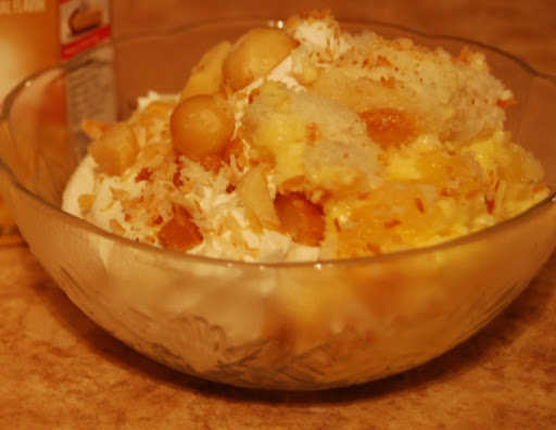 Using a trifle bowl or a large glass bowl, layer ingredients: half of the cake pieces, half of the pineapple, half of the coconut and half of the macadamia nuts.