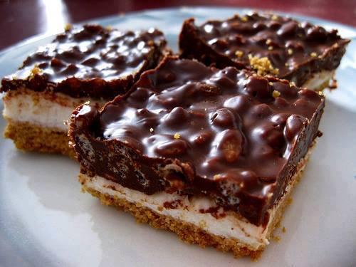 3. For topping, combine chocolate chips, peanut butter and butter in a small saucepan. Cook over low heat, stirring constantly, until melted and well blended. Remove from heat; stir in cereal. Immediately spread over bars. Chill.