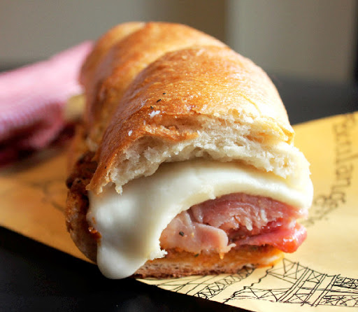 Remove from oven. Top sandwich with Genoa salami and prosciutto. Slice sandwich into 4 pieces and enjoy!