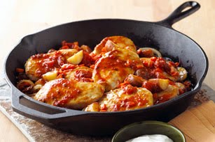 COOK and stir onions in remaining dressing in same skillet 3 min. or until crisp-tender. Return chicken to skillet. Add tomatoes, potatoes, carrots and peppers. Bring to boil; cover. Simmer on low heat 25 min. or until chicken is done (165ºF) and potatoes are tender, uncovering after 10 min.