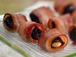 Stuff the prunes with the almonds. Cut the bacon in half and wrap a piece around each prune. Set on a baking sheet and broil until the bacon is crisp, about 10 minutes, turning once. Serve hot with cocktail picks for spearing.