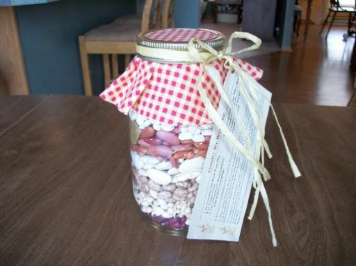 Layer ingredients in 1 quart wide mouth jar in following order: baby lima beans, kidney beans, Great Northern beans, red beans, navy beans and pinto beans. Slide bay leaves down side of jar. Place onion, parsley, bouillon granules, garlic, thyme, oregano, black pepper and red pepper flakes in small food storage bag. Seal bag and place in jar. Seal jar.