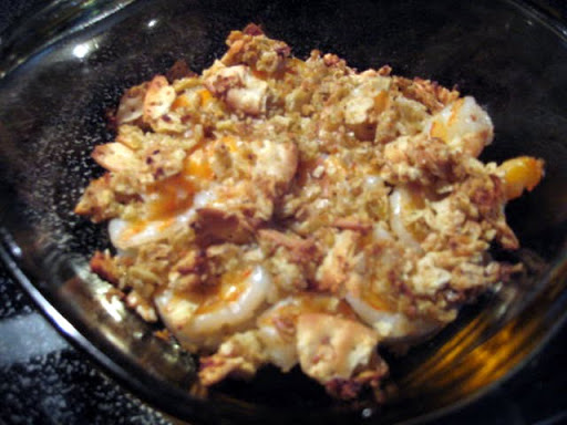 Preheat oven to 400F. Melt butter/margarine in sauce pan. Add crackers, minced garlic, scallions and saute until crackers are browned. Arrange shrimp in shallow baking dish and spread saute mixture over shrimp. Sprinkle seasonings and bake for 20 to 25 minutes at 400F.