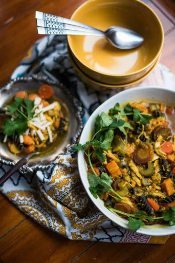 Allow sweet potatoes to simmer for about 10 minutes before adding carrots. Continue cooking for about 10 more minutes before adding turmeric, celery, and chicken. Bring to a simmer and cook for about 5 minutes, allowing celery to soften slightly. Add in pasta—I used black bean, but any kind works—and allow soup to come to a boil in order to cook pasta. Reduce heat when pasta is al dente. Taste frequently to gage if more salt and pepper are necessary.
