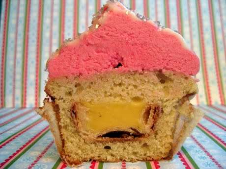 7. Spoon a heaping tablespoon of cupcake batter into paper-lined cupcake tins. Gently press one pie into each tin, and then cover with another heaping tablespoon of batter, so the top and the sides of the pie are completely hidden. The tins should be about ¾ of the way full (maybe a little more--that’s okay, too).