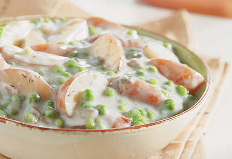 Stir the soup, milk, thyme and black pepper in the saucepan. Stir in the potatoes and peas. Heat over low heat, stirring occasionally until the mixture is hot and bubbling..