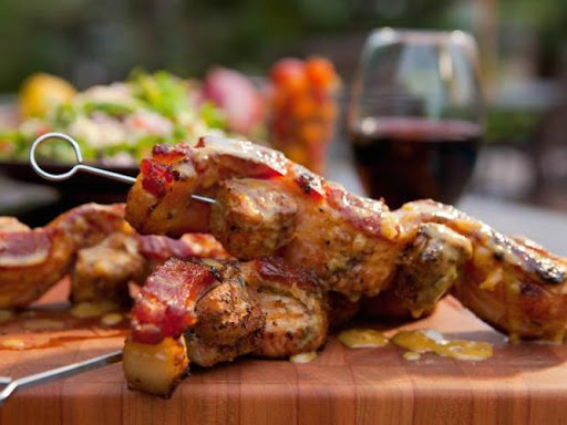 Heat a grill to medium and wipe down grates with oil. Place pork kebabs across grill and cook for 3 to 4 minutes on each of four sides until bacon is crisped around edges and pork is a tender medium. Once the pieces have been seared, glaze the kebabs with the Orange Honey Mustard.