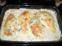 In skillet, heat two tablespoons of oil. Brown chicken two minutes on a side, adding remaining oil as needed. Mix corn starch with small aount of milk until smooth, add to remaining milk. In a sauce pan, heat corn starch and milk mixture until bubbly and thickened. Remove from heat, stir in wine and cheese. Pour 1/2 of the sauce in the bottom of a 13x9" dish. Add chicken before topping with remaining sauce. Cover and chill several house or overnight.