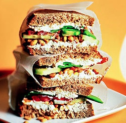 Spread one side of each bread slice with goat cheese. Sprinkle 4 of the bread slices with the soy nuts, gently pressing nuts into the cheese. Top with cucumber, tomato, and pea pods. Sprinkle lightly with salt. Top with remaining bread slices. Makes 4 servings.