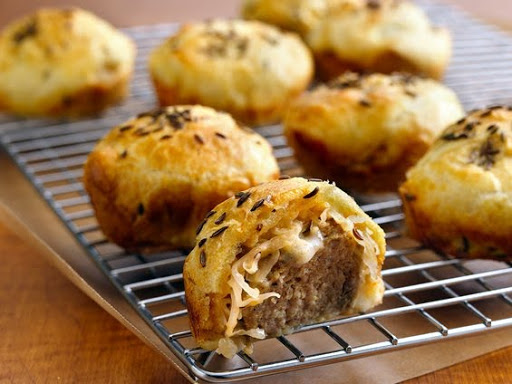 Place 1 meatball half, flat side down, in center of each cup. Spoon 2 rounded teaspoons sauerkraut mixture onto each meatball. Bring up ends of dough over filling; pinch tops to seal, leaving 2 small openings on sides to vent steam. Brush egg over dough. Sprinkle with remaining 1 teaspoon caraway seed.