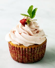 Make Strawberry Meringue Buttercream and spread or pipe about 1/2 cup frosting on top of each cupcake. Garnish with strawberries, cut into halves, quarters, or left whole, depending on the size.