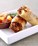 Place filled wrappers on prepared baking sheet; lightly spray surface of wrappers with cooking spray. Bake until wrappers are golden brown, flipping once, about 16 minutes. Yields 1 roll and about 1 tablespoon of salsa per serving.