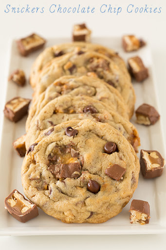Preheat oven to 350 degrees. In a mixing bowl, whisk together flour, cornstarch, baking soda and salt for 30 seconds, set aside. In the bowl of an electric stand mixer, fitted with the paddle attachment, whip together butter, brown sugar and granulated sugar until pale and fluffy. Stir in eggs one at a time mixing until combined after each addition. Blend in vanilla. With mixer set on low speed, slowly add in dry ingredients and mix just until combined. Add in chopped Snickers, chocolate chips and peanuts and blend on low speed just until mixed in.