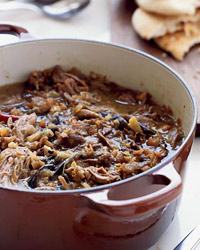 5. Return the lamb to the stew and season with salt and pepper. Divide the pita among 4 bowls. Ladle the stew on top and serve.