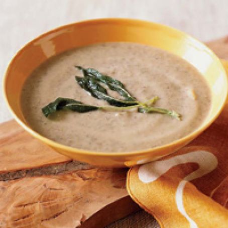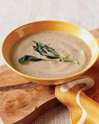 5. In a small skillet, heat the remaining 1 tablespoon of olive oil. Add the remaining 12 sage leaves and cook over moderate heat until crisp, about 30 seconds per side. Ladle the soup into bowls, garnish with the fried sage leaves and serve.