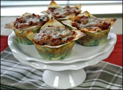 Evenly distribute about half of the turkey mixture among the cups, smoothing the surfaces with the back of a spoon. Top each turkey layer with 1 tbsp. mozzarella cheese. Place another wonton wrapper into each cup, lightly pressing it down on the cheese layer and along the sides of the cup, letting the edges fall over the pan. Repeat layering by evenly distributing remaining spinach-ricotta mixture and turkey mixture among the cups. Top each cup with 1 tbsp. mozzarella cheese.