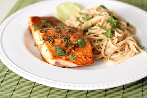 Preheat the oven to 400 degrees. Place the salmon filets, skin side down, on a baking sheet lined with greased foil. Brush with half of the marinade and bake for 10 minutes. Brush with remaining marinade and return to oven for 10 minutes more until salmon is cooked through. Top with additional cilantro. Serves 2.