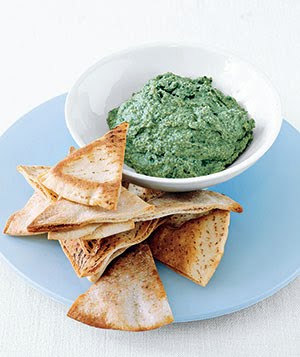 Meanwhile, squeeze the spinach to remove any excess water. In a food processor or blender, puree the spinach and hummus. Spoon into a dish and serve with the pita chips.