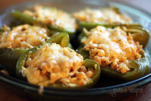 Preheat oven to 350°. Cut peppers in half removing seeds and stem. Place peppers in an oven-proof dish. Fill each pepper with 1/3 cup of chicken and bean mixture. Pour about 1/3 cup water or chicken broth on the bottom of the dish. Cover tight with foil. Bake 30 minutes at 350°. Remove foil, top with cheese and bake uncovered another 5 minutes