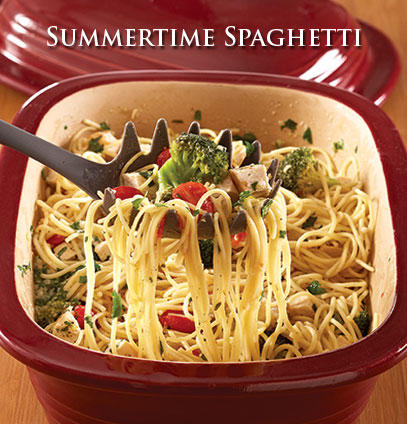 2. Break noodles in half. Combine noodles, broth and lemon juice in Deep Covered Baker.