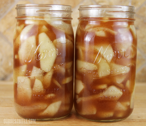 Tightly pack apples into sterilized jars. Slowly pour syrup over apples, covering them completely. Gently tap jars on countertop to allow air bubbles to rise. Screw lids on jars.