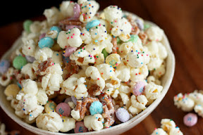 Melt Vanilla Candy Melts in a microwave safe bowl on HIGH power in 30 second intervals, stirring after each interval until melted and smooth. Drizzle half of melted chips over popcorn mixture, then stir, tossing gently a few times with a rubber spatula. Then drizzle remaining half of melted chips over popcorn, and gently stir mixture until evenly coated (don't over stir though or your sprinkles wont stick if the white chips begin to set and harden). Pour mixture into a single layer onto wax paper. Sprinkle entire mixture evenly with sprinkles before vanilla chips set. Allow to cool and harden, then gently break into pieces and store in an airtight container.