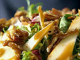 Assemble salad by tossing greens and cranberries with maple-balsamic dressing. Top with sliced pear, shaved Parmesan and candied pecans.