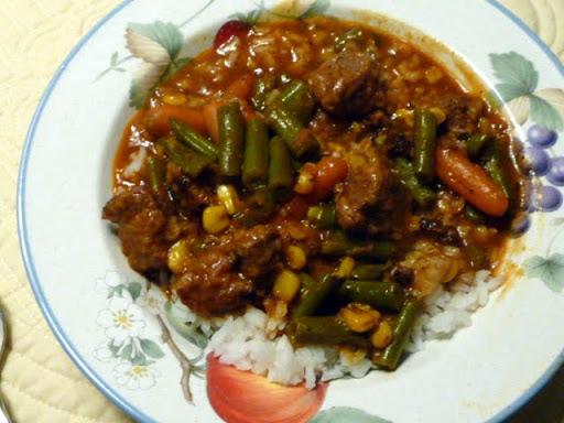 Next add tomato sauce, water, bay leaf, corn, green beans, carrots, and seasoning mix. Stir well to desolve seasoning mix.